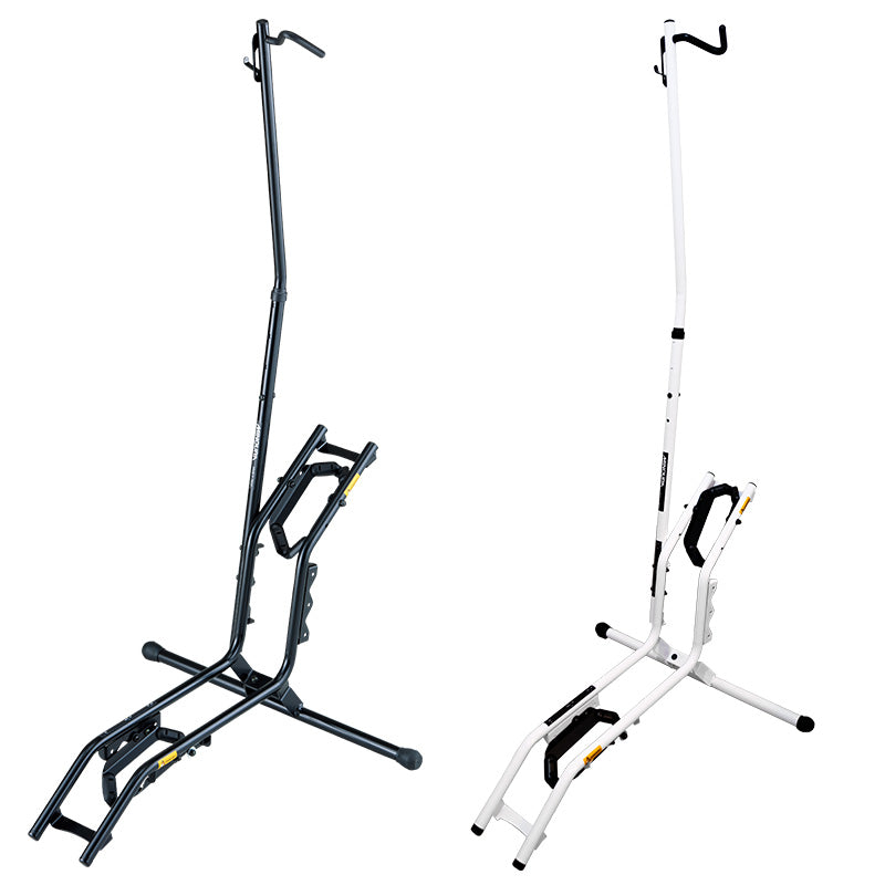DS-2200は縦置き、横置き両方に対応するディスプレイスタンド。ご自宅のスペースに合わせて使えます。シーソー形状のタイヤ受けのため少ない力で簡単に自転車を設置することができます。支柱上部のフックにはヘルメットを引っかけることもできて便利です。