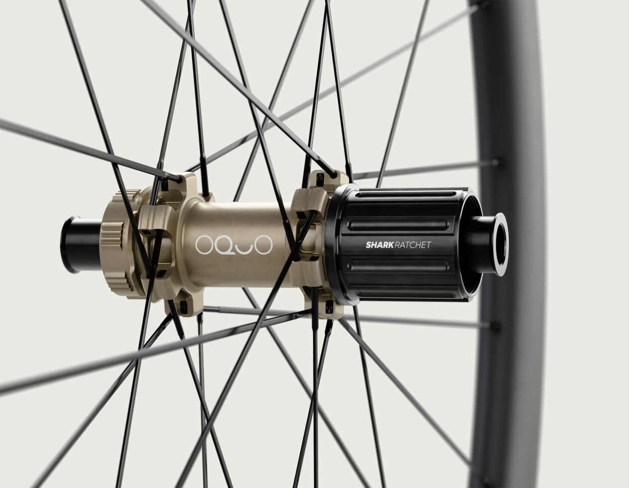 RP35 LTDの中核はOQUO Q10(表記:Q1O)ハブ。 ハブ内部機構はSHARKRATCHET、エンゲージは8° / 45(メーカー表記)です。 この「掛かりの早さ」は、ヒルクライムの勾配変化や登り返し、スピードが落ちた状態からの踏み直しで効きます。 またメーカーは、Q10ハブを軽量化と転がり抵抗の低減に加えて、信頼性とメンテナンス性も重視した設計として説明しています。