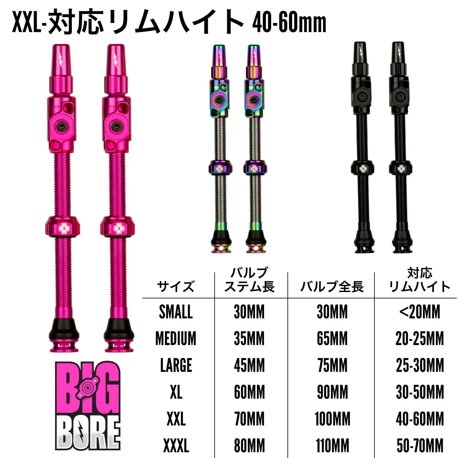 リムの深さに合わせて4サイズ。必要なバルブの長さは、リムの高さ/深さによって異なります。BIG BOREは装着できるリムハイトに制限がありますので注意が必要です。