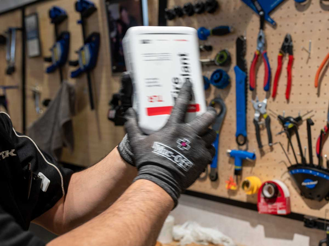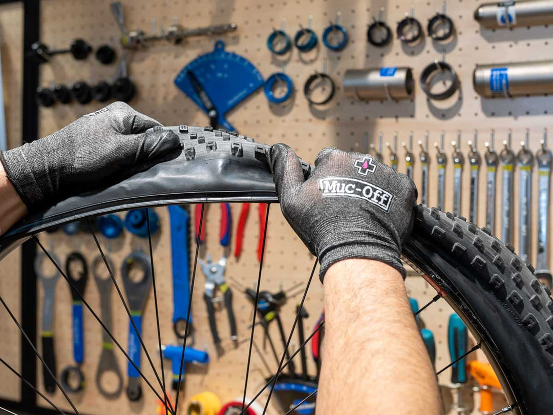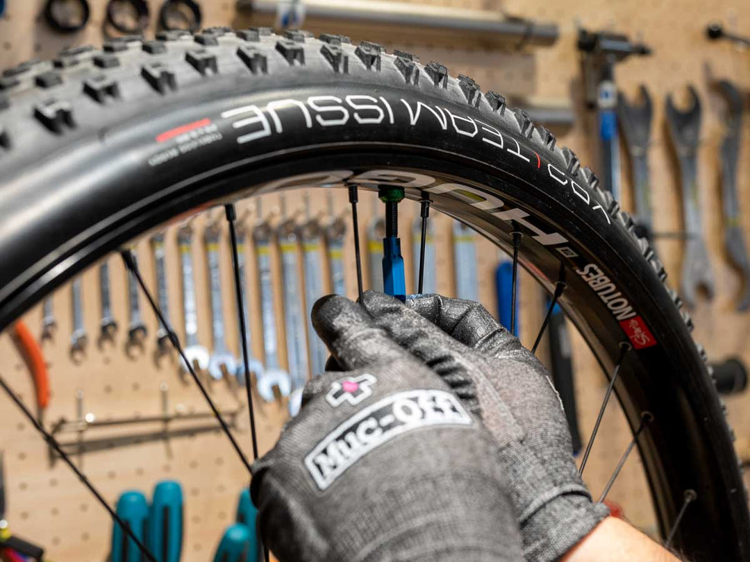 シーラント液が、ビードとリムの境界、バルブとリムの境界などのエア漏れが発生しやすい場所並びにタイヤ全体に行き渡るように、角度を変えながら車輪を回転させます。ハブ軸を両手で持ちながらスポークを親指で押して車輪を回転させれば、角度を変えるのも簡単です。