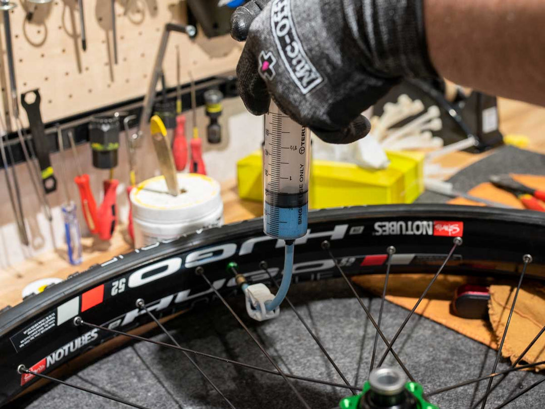 今回はタイヤが十分太いこともあり車輪を作業台に寝かした状態で注入。ロードバイクなどの細めのタイヤの場合は、シリンジを取り外す際の逆流を防ぐために、寝かして入れるのではなく、バルブが4時か8時あたりの角度になるように車輪をどこかに立て掛けて注入するとよいでしょう。