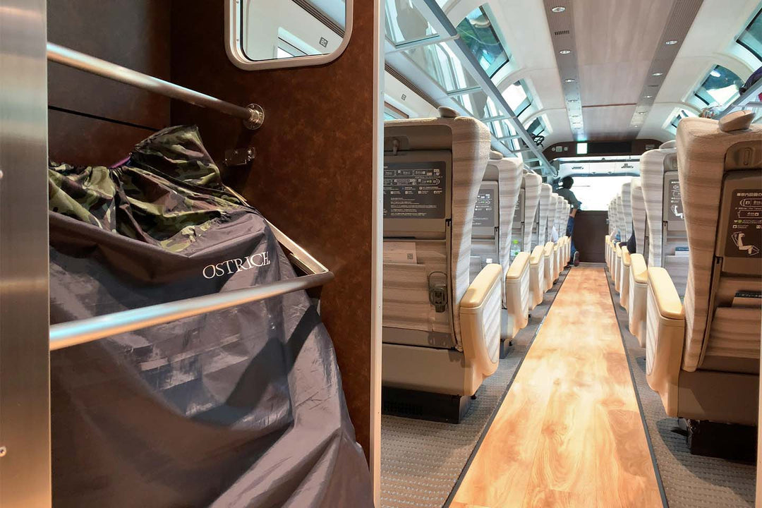 事前に座席指定が取れるようなら、車両最後尾のシートを指定しておくのがおすすめ。座席うしろのスペースにぴったりと収まります。普通列車のグリーン車にも同様のスペースがある場合もあります。